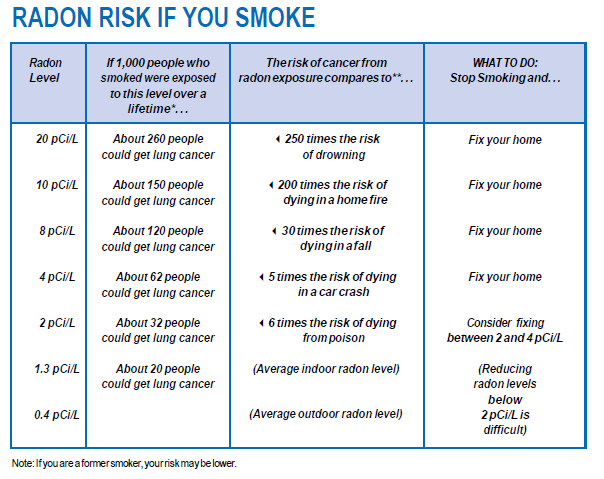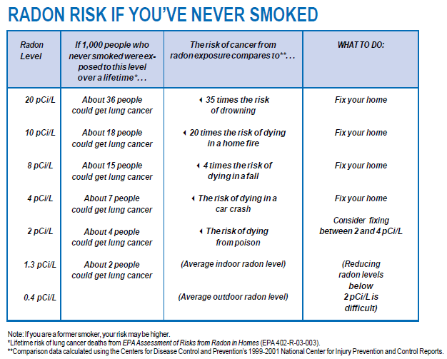 To put the risk of getting lung cancer from Radon into some perspective, here are two tables reproduced from the EPA’s own A Citizen’s Guide to Radon